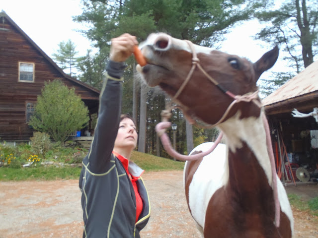 Saturday I got over to the farm quite late. No one was around and Christine had called to say she couldn't make it. I tacked up Lilly and headed out on the trail alone. The sun has made a hasty escape. It felt damp and gloomy. However, Lilly did manage to bury her face in some pretty hay in the Winter Pasture.